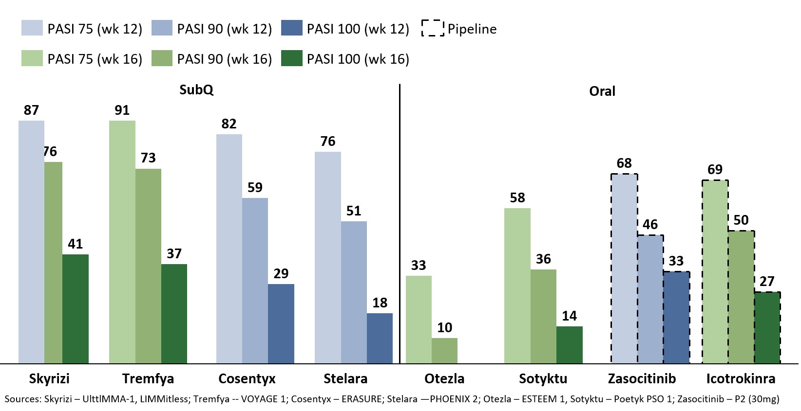 Exhibit 1. Percent patients reaching PASI75, PASI90, and PASI100 clearance for select in-market and pipeline Psoriasis drugs